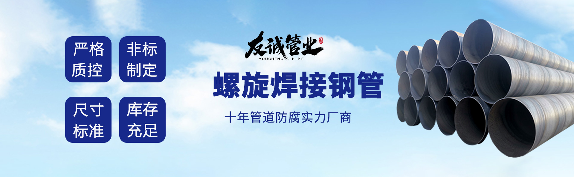 滄州友誠管業(yè)有限公司是一家專業(yè)從事生產(chǎn)防腐涂塑管道及管件于一體的大型企業(yè)。公司注冊(cè)資金8600萬元,位于中國管道生產(chǎn)基地—河北鹽山縣,近靠京滬高速、榮烏高速、黃石高速30公里,高鐵滄州西站40公里,天津國際機(jī)場(chǎng)、濟(jì)南遙墻機(jī)場(chǎng)150公里,為客戶來訪及業(yè)務(wù)發(fā)展提供了便利的交通條件。        鋼管系列:螺旋鋼管、無縫鋼管、ERW直縫焊管、JCOE埋弧焊直縫鋼管、熱鍍鋅鋼管。        涂塑系列:內(nèi)外涂塑鋼管、涂塑復(fù)合鋼…… 了解更多